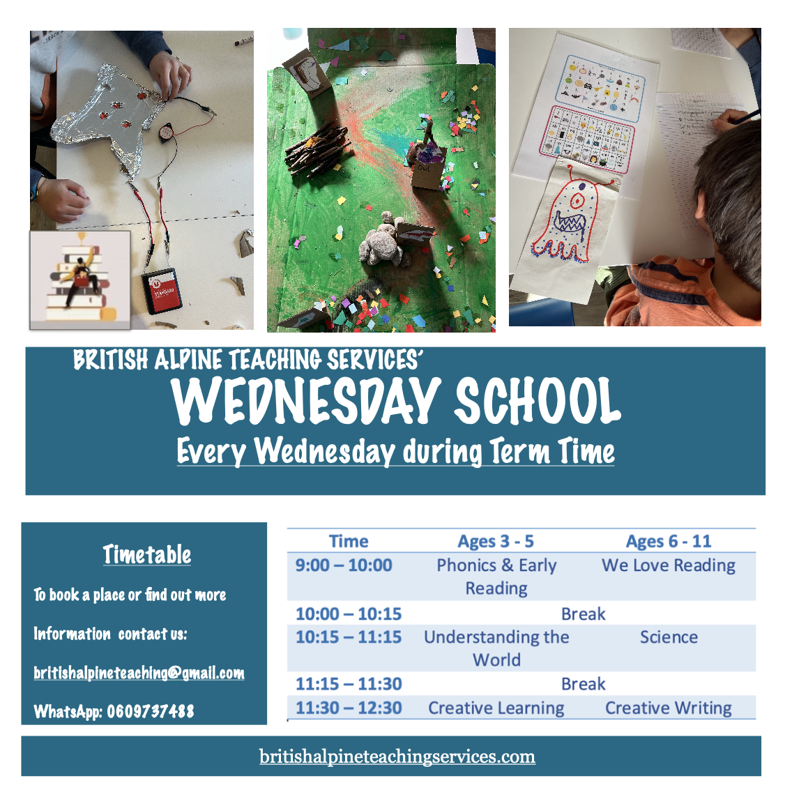 Full time daily classes for 3 - 12 years olds covering the UK National Curriculum, small group classes in our British Alpine Wednesday School, Holiday Learning Camps with Forest School, 1-1 tuition, SEN support and much more……
